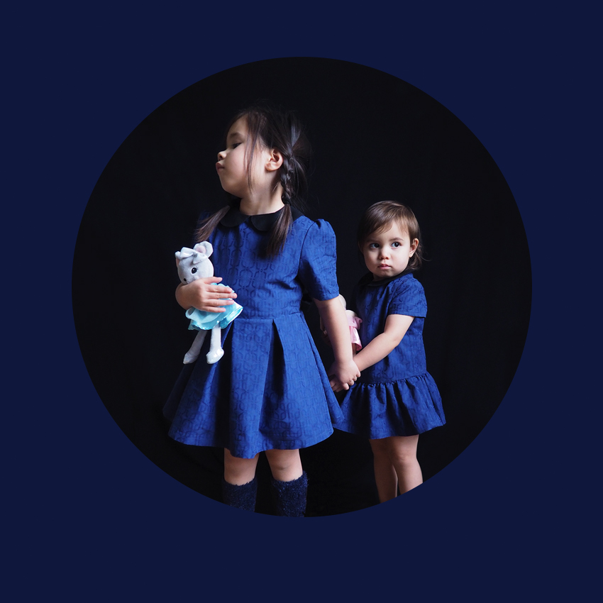 For a royal christmas, I chose a blue sapphire color and add black and silver to get a simple color range. The dresses are in the same fabric but in two different models.